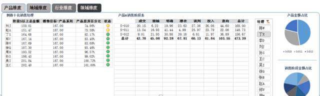 故事的尾声结束在对不同销售维度的细节展现上,通过前边的内容,精明的销售管理人员已经可以大致做出大方向上的决策判断了,再通过阅读尾声的细节图表信息,销售人员便可以对某个具体销售人员做出更细致的销售指导,以便大的销售策略能够得到顺利的开展。尾声部分的内容是通过少量VBA程序、切片器、Power Pivot数据透视图表、KPI指标设定等功能实现的。