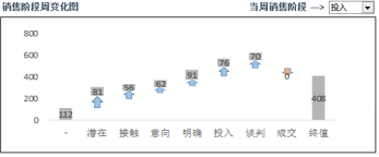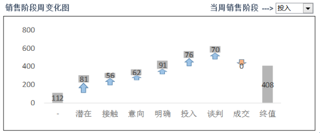 故事的高潮部分是用一个动态的组合柱形图展现的。通过此图我们可以清楚地了解到需要重点关注的销售阶段是由上周的哪些销售阶段转变而来的。比如上图反映的就是当周“投入”阶段的商机就是由上周“潜在”阶段贡献81、“明确”阶段贡献91……组合而来的。了解了商机的周变化情况,就可以判断销售人员对手头商机的推进力度情况,为是否该做出让销售人员积极推动商机的决策提供了更深层的数据依据。