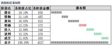 故事的开展是由表现各销售阶段商机占比情况的瀑布图展现的,通过瀑布图我们可以了解到低阶段商机与高阶段商机的占比情况,以及商机总量的数值情况。如果低阶段商机多,说明商机向高阶段转变乏力,需要销售人员积极推进,如果商机总值低,则需要补充新商机进来。此阶段的瀑布图是通过excel基本函数rept得来的。