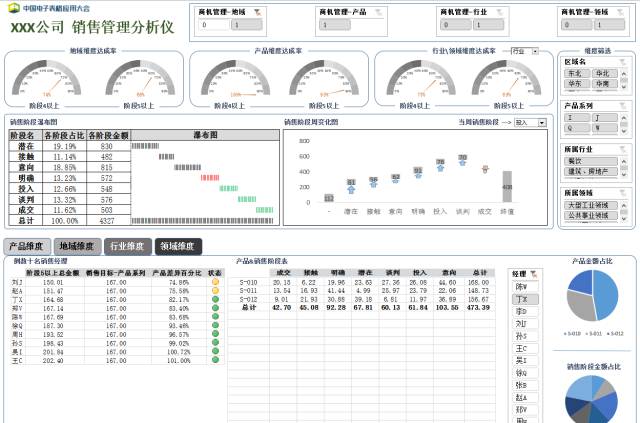 在满足以上所有分析需求后,我们就可以在Excel平台上制作会讲故事的销售管理分析仪了,制作分析仪的目的在于有条理的、简单易懂地告诉销售管理者你手中的商机处在何种情况下、它们可能正面临何种问题、需要管理者及时做出何种响应来回避风险,达成销售目标。