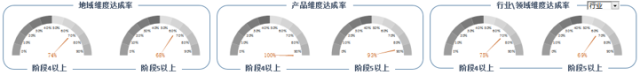 在案例中,销售阶段4以上的商机总金额需达到销售目标值得1.2倍以上,而销售5以上的销售目标值需达到销售目标值的1.5倍以上,才能预测在销售周期内有可能完成销售目标。所以六个仪表盘就分别代表了在不同销售维度中销售阶段4以及销售阶段5以上商机总金额与目标值之间的占比情况。我们从中可以迅速发现最有问题的销售维度在哪里。