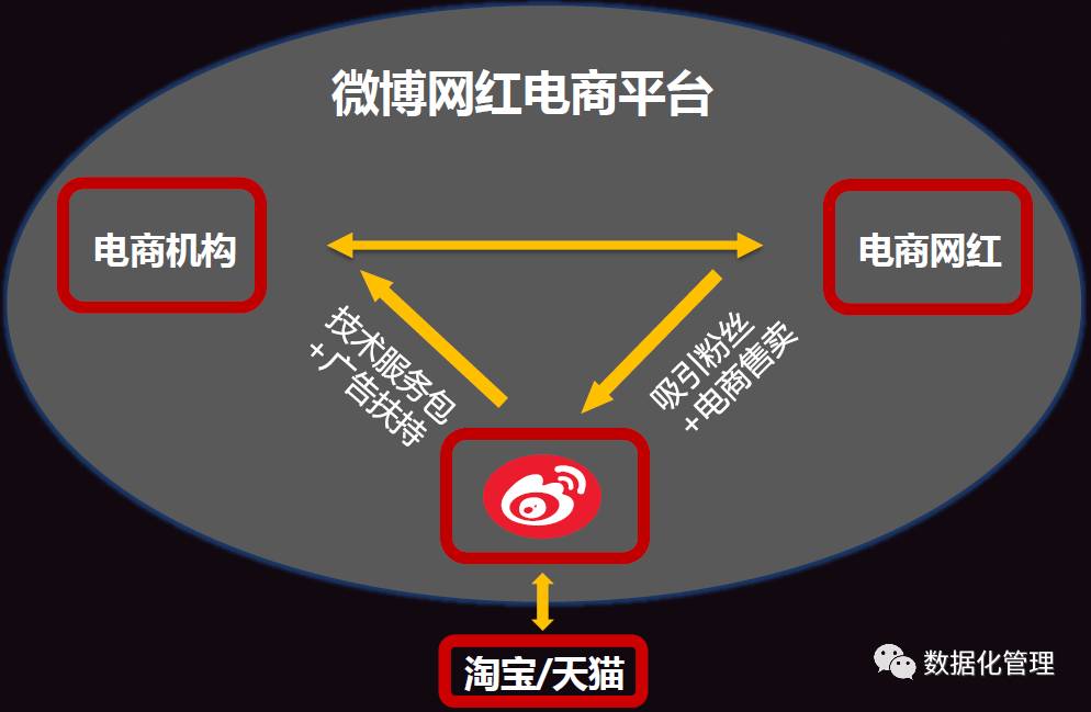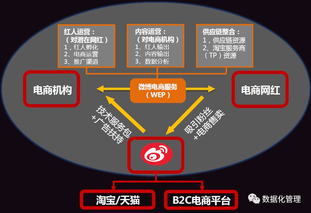 网红电商平台不仅仅是打通网红和电商、机构和电商的连接,还引入WEP的服务(微博电商服务),辅助电商机构运营、策划,帮助他们匹配电商网红,提供数据分析服务,目的是促进生态的良性循环。