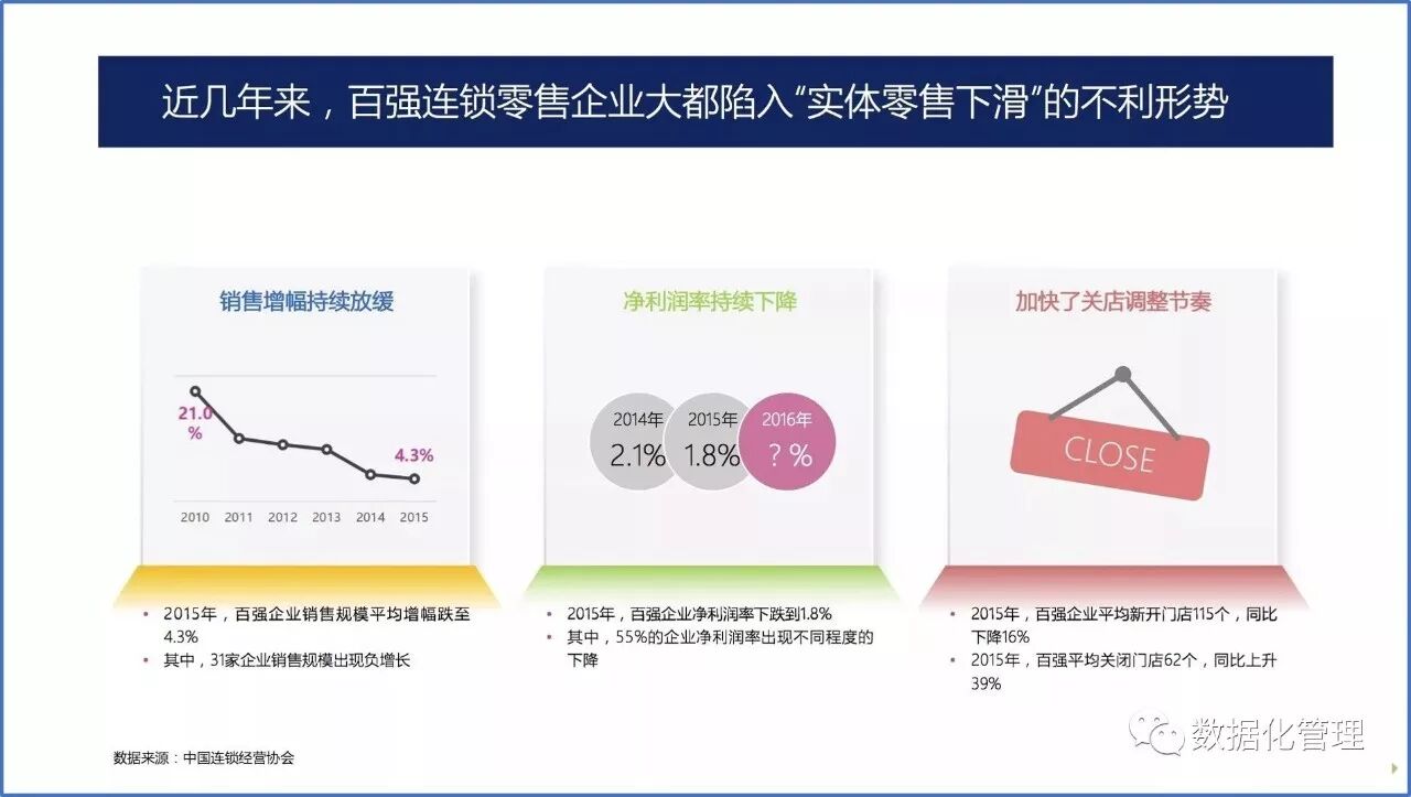 同时,也有一些媒体开始唱衰实体零售业。比如经常会爆出一些百强企业的销售增幅持续放缓或者出现负增长,一些企业的净利润率有些下跌等情况。