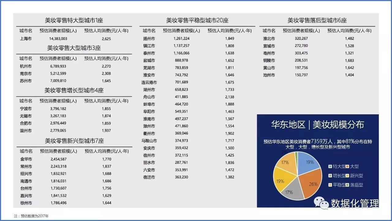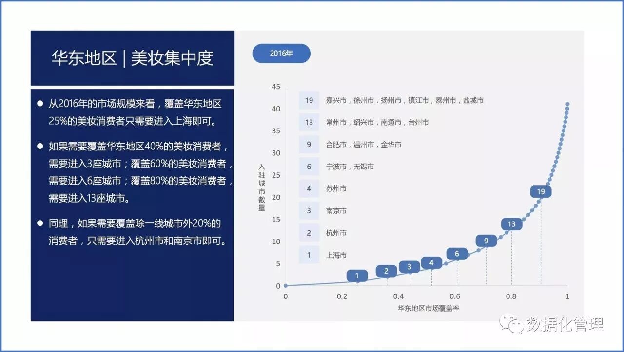 对应到具体的商业决策,2017年美妆行业的零售企业或是消费品牌,如果是计划覆盖华东地区50%的美妆消费者市场,其实需要入驻上海、杭州、南京、苏州四个城市就可以了;但如果计划覆盖华东地区80%的美妆消费者市场,还需要再进入其它的九个城市。当然我们说的都是在理想的状态下所产生的情况。