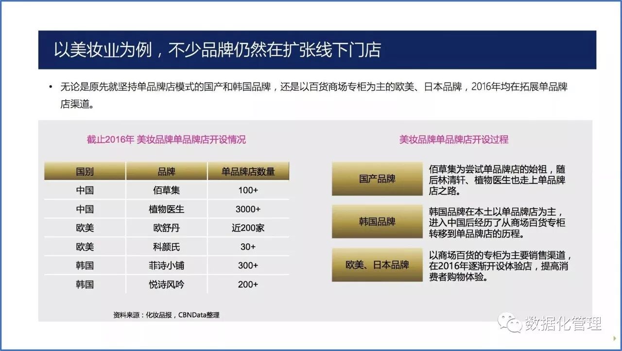 下面左边的这张图,是截止到2016年一些品牌的单品牌店开设的情况,它们的门店数量还是十分惊人的。这些品牌中既包括了单品牌店模式为主的国产和韩国品牌,也包括了百货商场专柜为主的欧美、日本品牌。