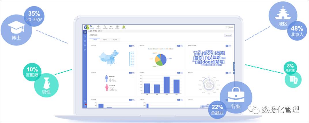 秒级响应,丰富的可视化图表,简单的操作界面,大屏技术早已经是市面上主流BI产品的标配,数说立方当然也具备这些特性,我自己是经常用这个产品分析微博的一些舆情,深有感触。除了这些特点外,一个好的BI产品还应该有自动给用户贴标签的功能,数说立方的核心技术用户画像可以一键生成人口属性、内容属性、关系属性、购物属性等四大维度标签,深度剖析TGI指标、普通指标,共同解读目标受众。