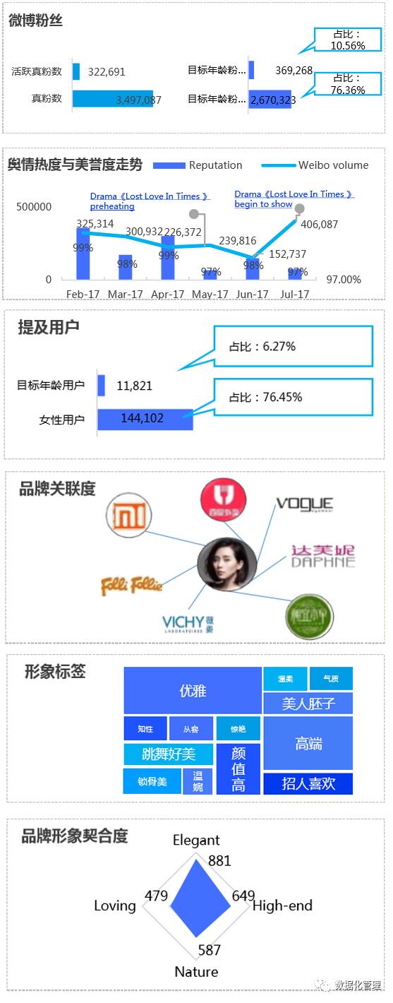 通过数说雷达不但给每个候选明星和竞品明星进行了量化评估,并且进行了重点候选人的提示。其中刘诗诗运营效果、粉丝基础和美誉度排名均在Top 5, “知性”、“优雅”形象突出,与品牌调性较为契合,所以对刘诗诗数据进行了深度挖掘。