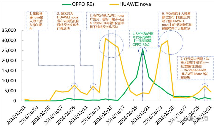看一个数说立方的具体案例,OPPO R9s和华为nova的在去年10月的营销活动分析。剔除噪音后OPPO有10万级的声量400万的互动量,华为有25万声量和1200万的互动量。从数据总量来看当月华为在营销中完胜OPPO。