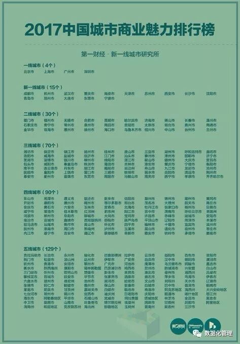 一共338个城市:其中4个一线城市、15个“新一线”城市、30个二线城市、70个三线城市、90个四线城市和129个五线城市。