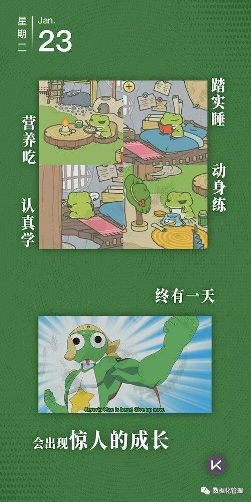 健身社区应用Keep就画出了小青蛙经过一番努力长大后变成肌肉蛙的脑洞版结局,鼓励人们线上健身。