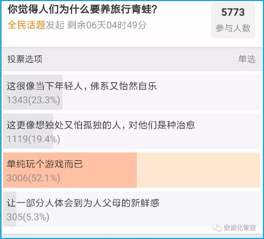《旅行青蛙》这个游戏火了以后,@全民话题 对人们为什么要养《旅行青蛙》发起了一个调查,结果显示: