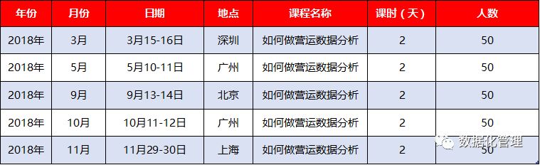 我正开始准备春节后的公开课培训,2018年我计划只开五场《营运数据分析》公开课,今天开始2018年第一场深圳站(3月15-16日)的报名,名额有限,有兴趣的朋友赶紧了。(报名方式请往下看)