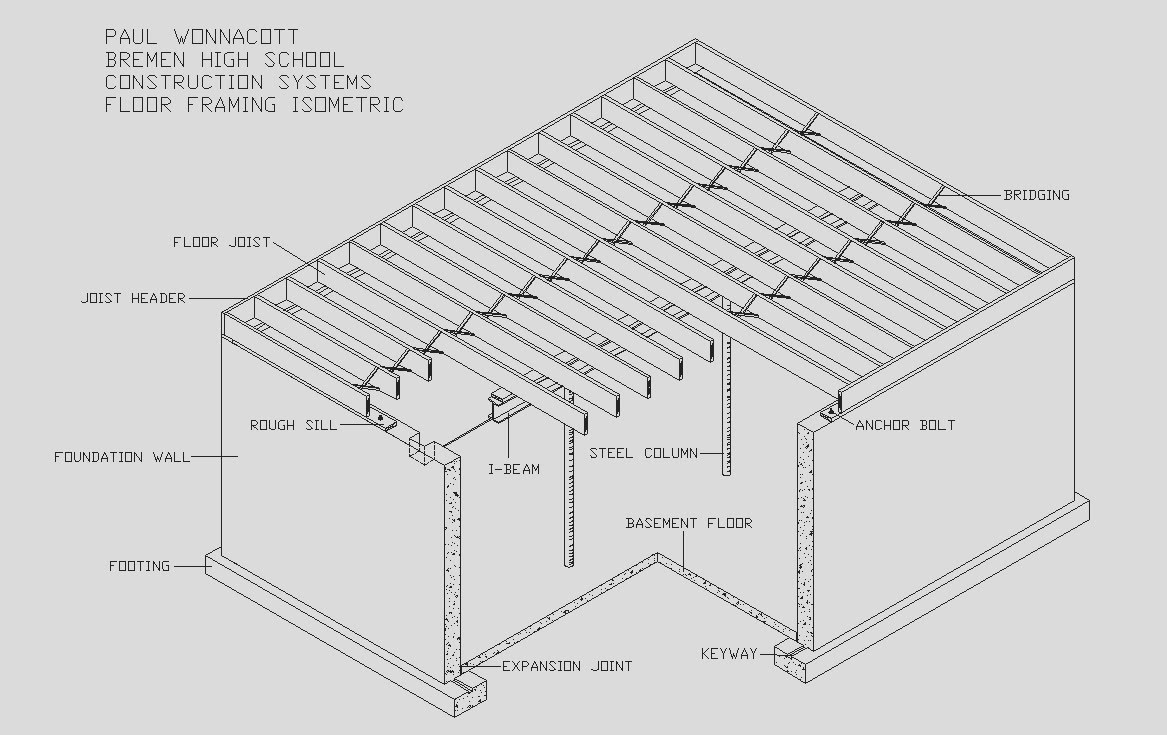 PAUL WONNACOTT BEEMEN HIGH SCHOOL CONSTRUCTION SYSTEMS FLOOR FRAMING ISOMETRIC: