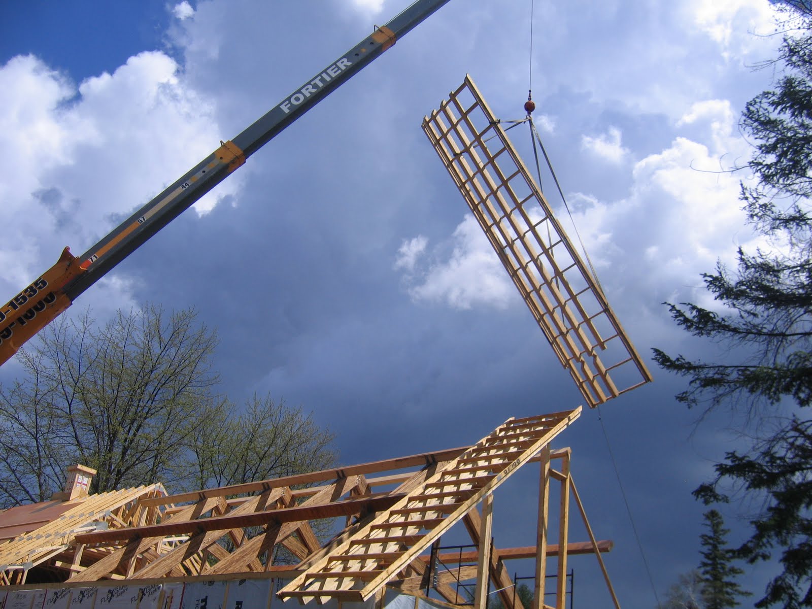 某重型木结构独立小住宅,屋顶位置,屋架部分的施工现场。