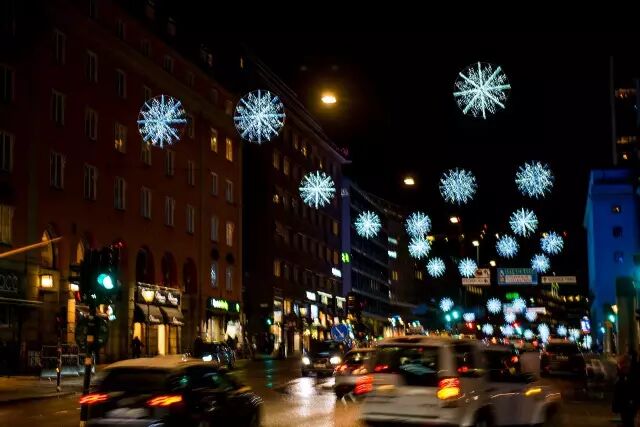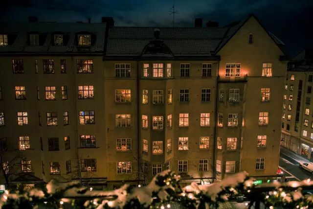 从瑞典南部的大海、原野、花朵和小镇,到斯德哥尔摩此刻黑暗中的冰雪。车窗外,是夜色中明亮的街灯和行走的人们,每家每户的窗子都是透明的,没有遮挡,窗前摆放的是三角形或圆拱形的圣诞烛台,闪闪亮亮的光芒连成一片,犹如梦境。