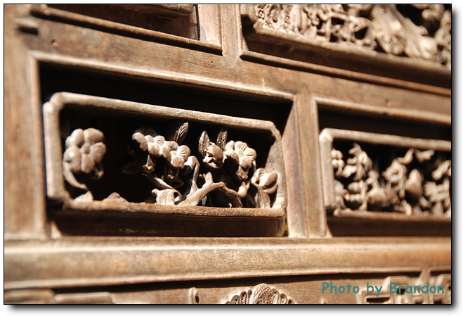 冷静坚实的外墙内包裹着一层木结构,有着繁复的雕花,多是花开富贵、多子多孙的题材。屋内光线黯淡,窗棂层层叠叠,有说不出的压抑。有钱人家的二楼会修个美人靠。其实是个小小的阳台。在一个好天气里,无所事事的小姐坐在楼上晒太阳,看街上的过客匆匆和船只来回穿梭。或许被一个俊朗的书生看到,从此展开一场风花雪月的事。