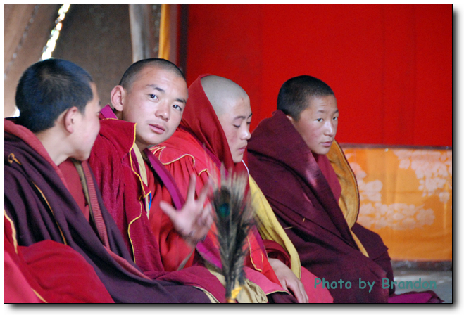 念经的和尚里有些很小的和尚,好奇地盯着我们在帐篷里拍照。更藏说这么小的小孩还没法真正理解佛法,不像他,一进寺庙就立刻找到了归属。更藏是16来阿柔大寺,到现在8年了,他打算一辈子都呆在寺里。更藏小学没毕业,但他的思想有种朴素的深刻,有时说出话来让人微微一震。