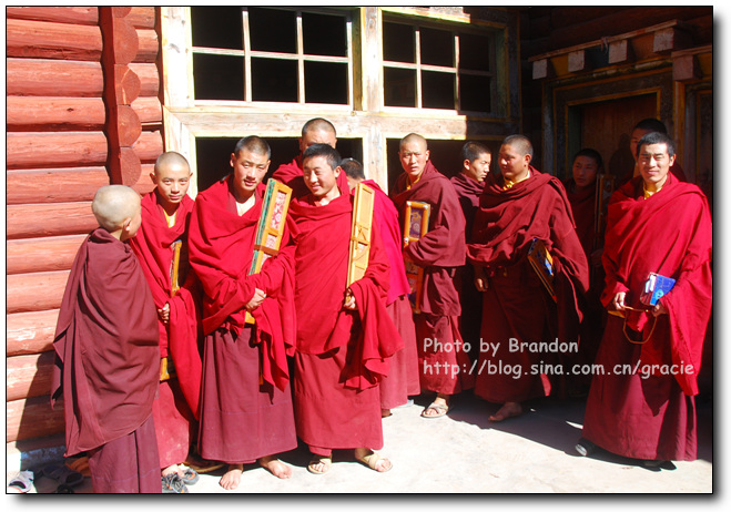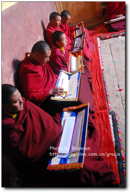 我们正在佛学院的院子里闲逛的时候,一个喇嘛向我们招手,把我们请进了他的宿舍,他,就是四拉鲁布。四拉鲁布已经通过考试,从佛学院毕业了,现在应该算是留校任职。他住单间,很小的房间,一张单人床、一个坐榻,基本上剩下的空间只能站两个人了。他的汉语有限,交流起来还是很困难,我们大概听明白了他的工作类似是大学里面的宿舍管理员,三个人每人一天轮着值班,每个月30元钱的工资,寒暑假学生放假了他们可以回家探亲,也可以出去云游,佛学院会给他们1000多块钱的路费。他从8岁就进佛学院读书,现在22岁了,从来没有离开过德格。他的生活很简单,每天早课、下午课、晚课都是念经,他喜欢这样与世隔绝的生活。四拉鲁布讲话的声音很平静,他拿出一本影集给我们看,里面都是他和他的同学们在附近的山上、河边拍的照片,还有一些外面寺庙来的喇嘛活佛来讲经与他们的合影。佛学院很少有外人来,他和我们互留了电话号码,从此,我们成了他每天的牵挂,“你们现在在哪里?你们还好么?”这样的短信一路温暖着我们,也保佑着我们一路平安。