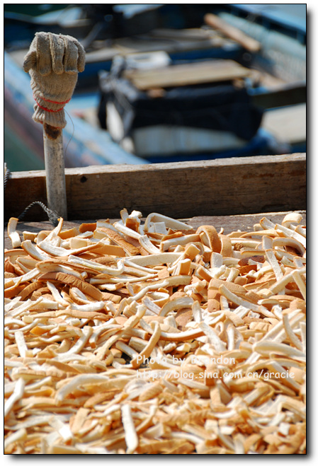 白色房子后面紧连着渔村。如今的渔村应该叫渔家新村,是一排排的小楼。公共休闲区,垃圾收集点,还有热心业主贴在墙上声讨物业的告示,像极了普通小区。只是,太阳下晾晒的除了新洗出来的衣服,还有渔网和新剥出来的虾仁。在渔村里闲逛要外加些小心,说不准从什么拐角就会踱出几条没栓链子的大狗,冲着你横眉立目地叫。只要知趣地后退,它们也不追,停在原地一直耵着你离开。