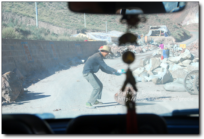过怒江大桥后,是一段很陡的盘山路,修路个人正在处理前两天的塌方,石块满地