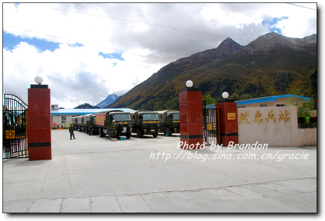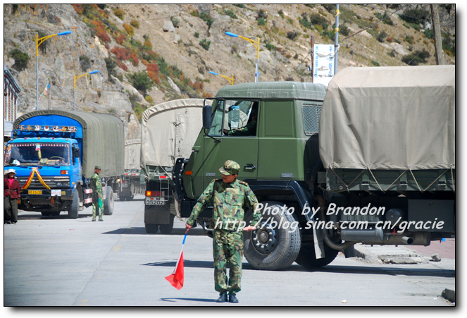 我们几个让司机师傅去休息,找旅社的老板帮忙包了辆车,下午去游然乌湖和来古冰川。司机是当地的藏族同胞,实在无法恭维当地人的时间观念,讲好的出发时间,司机晚到了,因为要拉着我们去来古村看冰川,司机又跑到一个类似超市的地方,装到车上几箱啤酒带到来古村那边,可以理解,那边出一次山不容易,有车进去就捎点东西过去,可是司机和卖啤酒的店主不知道在聊什么,任我们在车上等。结果,等到我们真的要上路的时候,赶上交通管制了。只有在大城市、首长们出行才会有的交通管制,在这个藏区的小镇发生了,是因为兵站内的军车要出去拉练,浩浩荡荡几十辆军车出行,我们像阅兵的首长一样站在路边,胡乱地给他们敬礼、摆手示意,玩得不亦乐乎。耽误了一个多小时的时间,我们终于上路了,这也直接导致了我们到来古村后无法徒步到冰川上并在日落前出山,遗憾。