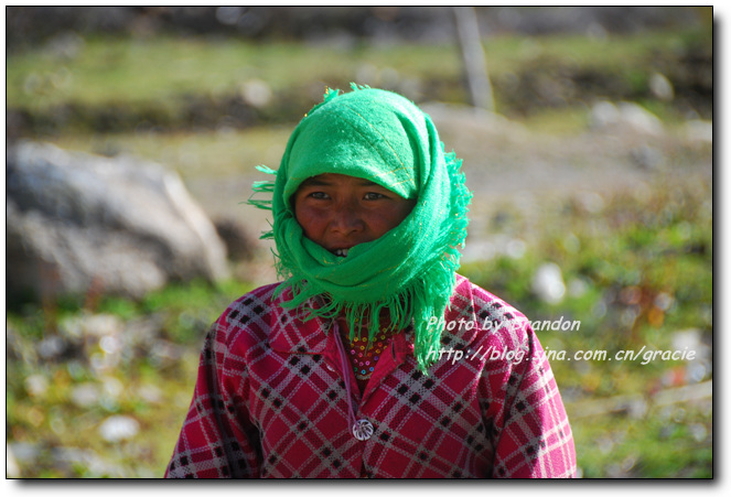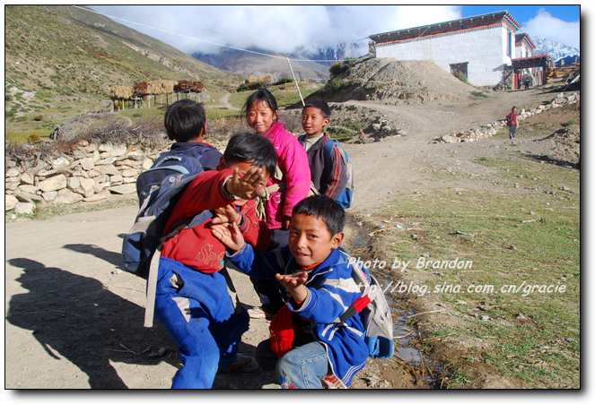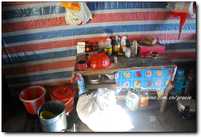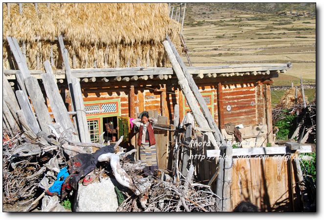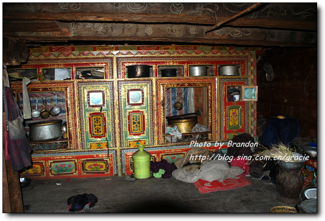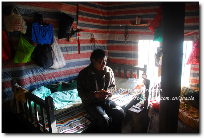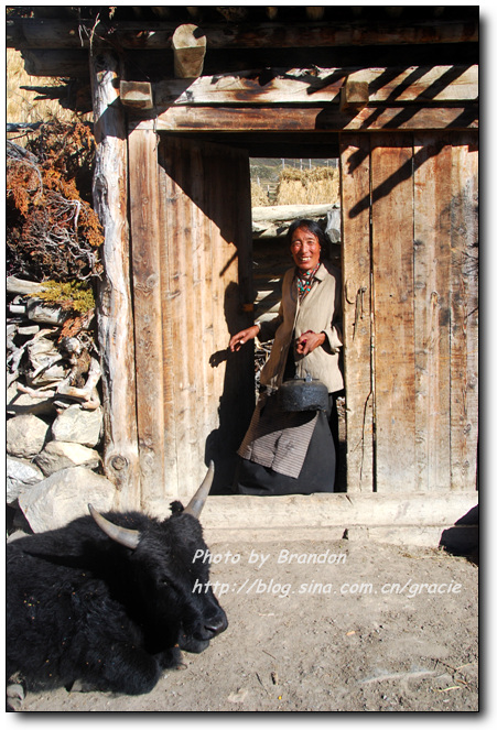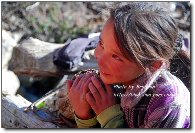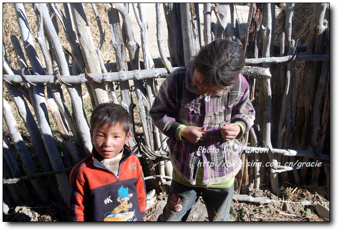 我们也搞不懂为什么会有这样的礼遇,进到藏民的家里,大人们把垫子铺在窗前让我们坐,主人拿出自酿的酸奶给我们盛了满满一大碗。藏民自酿的酸奶很稠,主人见我们喝起来还不太习惯,又拿出糌粑示意我们加到酸奶里搅拌来喝,加了糌粑的酸奶的确非常好喝,这是我们在藏区喝到的最地道的酸奶了。藏民家里比内地的农村还要简陋,一个大房间内锅庄占了很大的面积,靠北侧的墙边放着藏式的柜子,靠窗的南面墙边放着一些垫子和被子,没有床,一台收音机是唯一的电器。我们和主人只能有简单的交流,我们举着碗说酸奶好喝,他们只是灿烂的笑,两个一直跟着我们来的小女孩窃窃私语,不时看着我们偷笑一下,我们喝完了主人盛的酸奶,主人还要给我们加,我们摇手说谢谢,主人很羞涩的又站到房子中央看着我们笑。就在这样的午后,暖暖的阳光透过不大的窗子照进来,我们和几个素不相识、却又如此亲切的淳朴的藏民相视而笑,仿佛语言的交流显得多余了。他们,是这方净土的守望者。