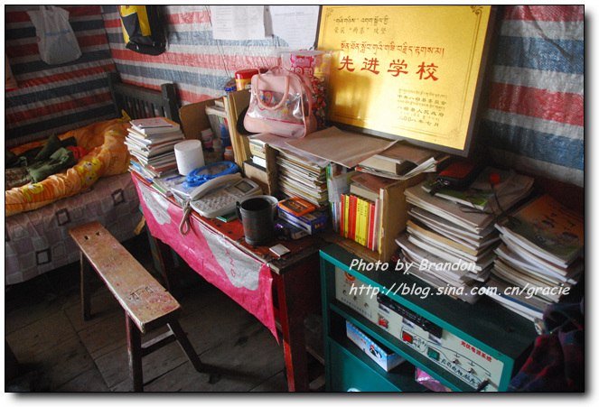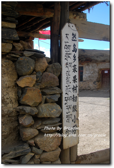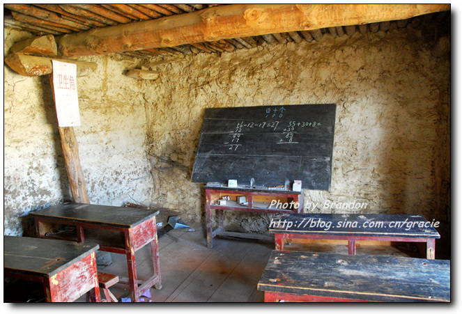 这个小学有三个班级,分别是一、二、三年级,到了四年级孩子们就要出山到然乌镇去接着读书。小学有两个老师,一个藏族老师主要教藏语文和数学,一个汉族小伙子教汉语文和音乐、美术。校舍简陋,共三间房,因为只有两个老师,每次上课的时候有两个班上课,另一个班自习。以前只在电视上看到一些介绍边远山区的教育情况的时候见过这样的学校和教室,简单而破旧的桌椅,默默守望的老师。