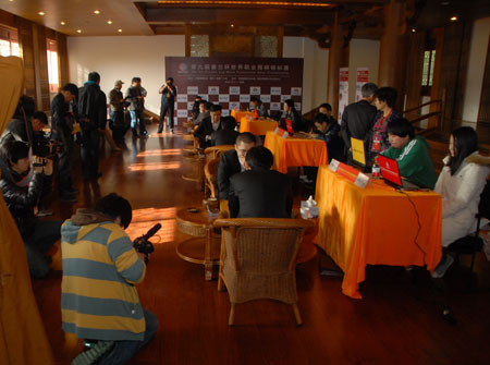 9点半比赛开始,前10分钟允许记者们拍照。人群中,一名僧人摄影师非常认真的对着8名棋手一个个的拍着照片。特殊的比赛环境,让人们对比赛有这更多的期待,一名记者就和身边的同行笑着说:“这次比赛,会不会因为放在灵隐,而变得特别有禅意呢?”