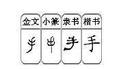 “手”字在金文中就是画了一只手的形象,有五个手指头,还有整个的胳膊。到了小篆时,五个手指的中指向一边歪斜,表示指头可弯曲。汉字的每个笔画是直,还是弯,都是有讲究的。隶书时,把上面弯曲的那个手指变成了一撇(丿),其他两侧的四指变成两横了,然后一竖勾(亅)是手掌和胳膊。楷书按照隶书没做变化,就有了“手”字。