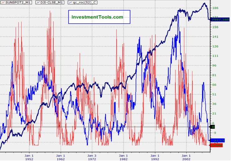 太阳黑子数周期与股市波动对比:红色为黑子数,深蓝为道琼丝指数,浅蓝为道琼丝指数的ROC变动率指标.
