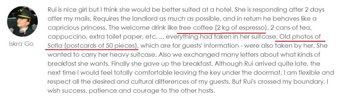 对于房东的评价,我认为她应该是记错了,我根本就没有见过她所提出的这两样东西,并且我入住时候也不是她接待的我,记错了是有可能的。另外,我在前往保加利亚之前遭遇车祸,尾骨轻微骨裂,腰部有些疼,爬楼梯提箱子希望有人可以搭把手,如果房东不愿意帮忙我也不会指责她,帮是情分,不帮是本分。我自己同房东私信,但是同样也不予理睬。