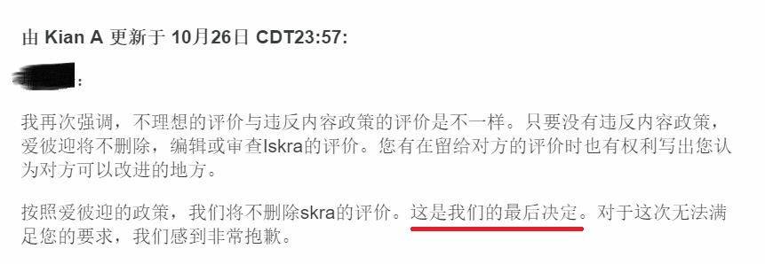 Airbnb在回复邮件里非常不客气的告知我“这是他们的最后决定”,回复也只是一些固定格式的话语。并且我只有一次机会来回复房东的评价。如果说房东不予理睬,客服又不作为,谁来保护使用者的权益呢?
