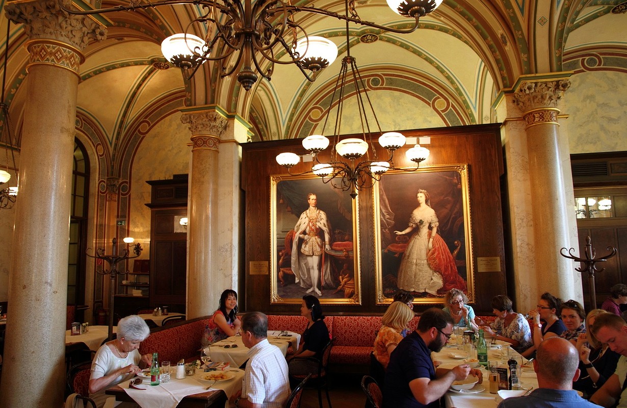 咖啡馆深处的一面墙上有奥匈帝国的最后一任皇帝弗朗茨·约瑟夫和茜茜公主的巨幅画像。贝多芬、舒伯特、约翰·施特劳斯父子、画家克林姆特、席勒、弗洛伊德等人也都曾是这里的座上宾。