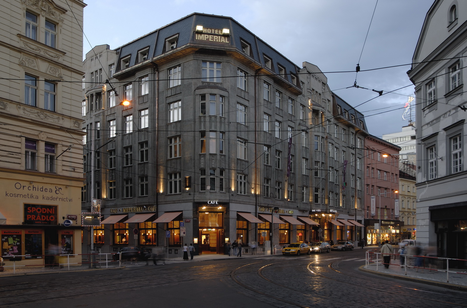 说是咖啡厅,其实早就变成餐厅了,一日三餐都能解决。咖啡馆位于共和国广场向东的Na Porici大道旁,6层淡灰色建筑物——帝国酒店(Imperial Hotel)的一楼,酒店自1914年开业,2005-2007年翻修,至今共有180间客房,是联合国教科文组织保护的历史建筑之一。