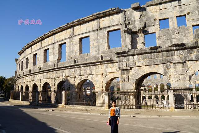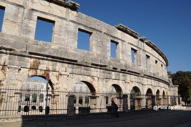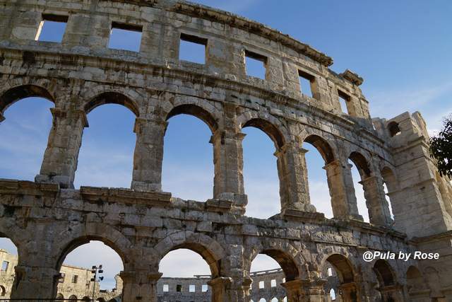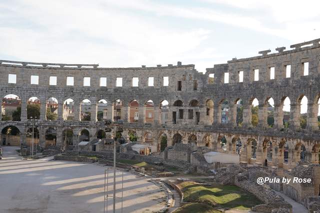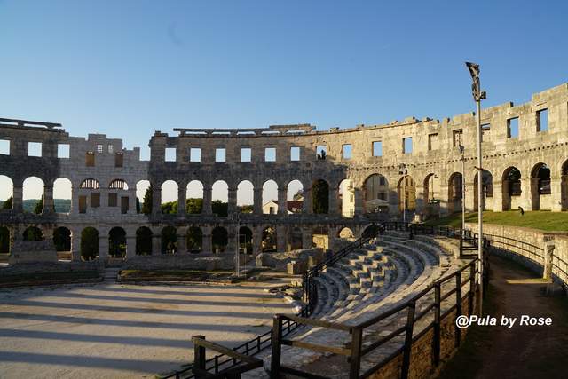 普拉竞技场(Pula Arena),由古罗马皇帝克劳狄一世(公元41-54年在位)下令建造,维斯帕西奥努斯皇帝于公元79年扩建,前后历经百年才完工。3层的竞技场呈椭圆形,长132米,宽105米,建造在一个天然的山坡上,中心表演场地长68米,宽42米,外墙共20扇门,可容纳2.3万余人观看表演,至今仍在使用,举办夏季音乐会、电影节。