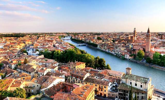维罗纳是意大利最古老、最美丽、最荣耀的城市之一,建城于公元前1世纪,拉丁语意为“极高雅的城市”。她位于米兰与威尼斯中间,阿迪杰河穿城而过,倒映着中世纪的城墙。古罗马帝国时期、中世纪和文艺复兴时期深厚的人文历史遗迹被完好地保留了下来,2000年城市就入选了世界文化遗产名录。