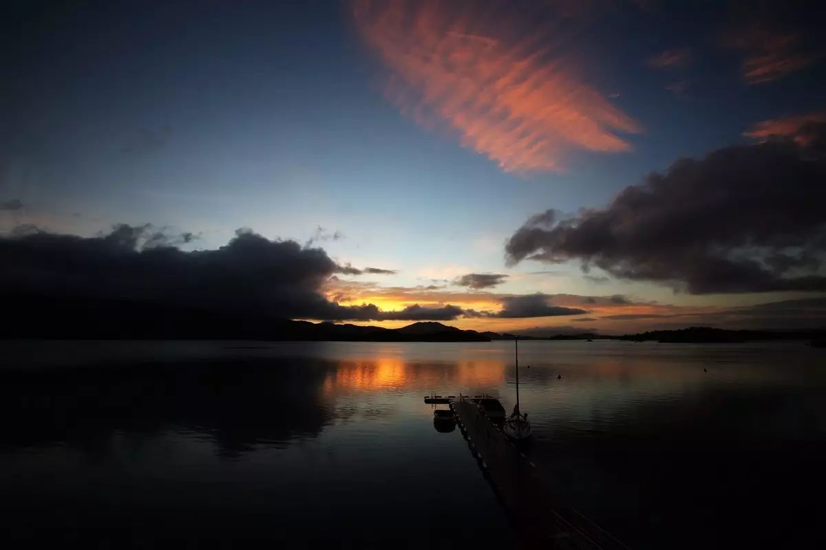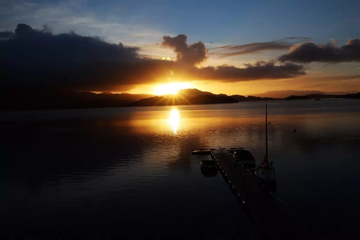 第二天一早拉开窗帘,就看到洛蒙德湖日出前金色的霞光