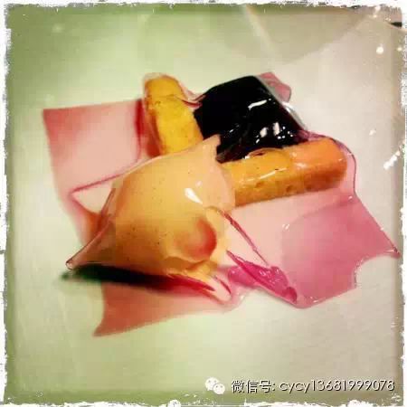 名为我的学艺之路这道菜,在小小的玻璃杯底层放入鹅肝慕斯,中间夹著以起士取代面条的北义豆泥意大利面,最上层再加上迷迭香泡沫,这是波杜拉向他生命中三位最重要的启蒙者致敬的料理,法国大师杜卡塞(A. Ducasse)、西班牙分子厨艺大师阿卓亚(F. Adria)及从小最宠他,教他料理的祖母。