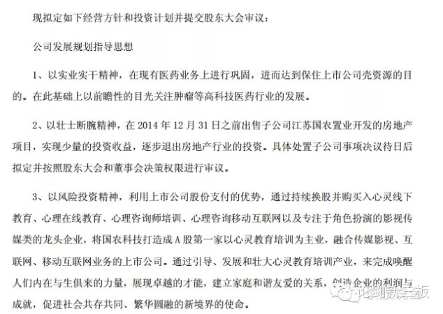 2014年4月30日,国农科技公布了公告,其中公开了股东吴丹对公司 经营方针和投资计划的提案,要求公司:以壮士断腕精神……逐步退出房地产行业的投资;以风险投资精神,通过持续换股并购买入心灵线下教育、心理在线教育、心理咨询师培训、心理咨询移动互联网以及专注于角色扮演的影视传媒类的龙头企业……通过引导、发展和壮大心灵教育培训产业,来完成唤醒人们内在与生俱来的力量……