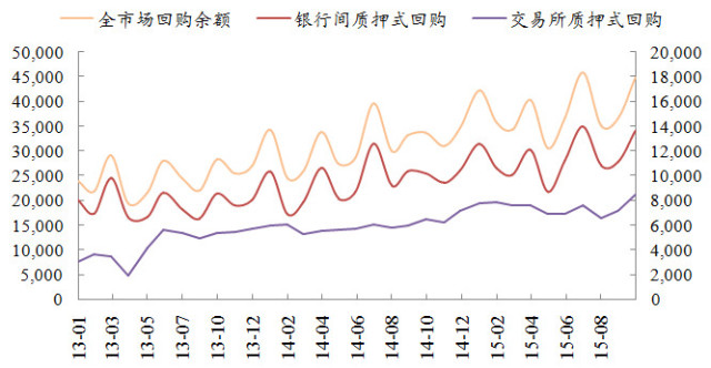 场内杠杆有准确的数据可以查阅。9月底全市场债券回购余额4.49万亿元,其中4.26万亿元(占比95%)为质押式回购,3.41万亿元(占比76%)为银行间市场质押式回购,8470亿元(占比19%)为交易所回购。