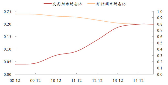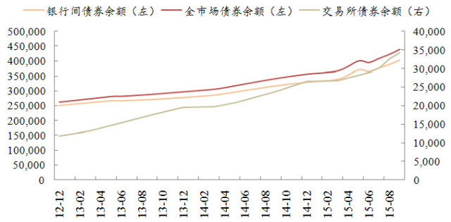 今年债市同样经历了大发展,9月底债券市场总托管量(中债登、中证登和上清所合计)为43.83万亿元,较6月末增长4.36万亿元,增幅为11.1%。其中,银行间市场截至9月底托管量为40.4万亿,较6月末增长3.84万亿元,增幅为10.5%;交易所市场截至9月底托管量为3.43万亿,较6月末增长5234亿元,增幅为18%。