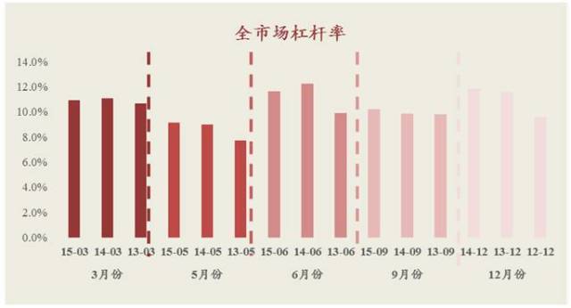 我们发现全市场总杠杆率在11%至13%之间,这个水平总体而言并不高。由于场外杠杆缺乏历史数据,且比场内杠杆小一个数量级,因此下面的分析主要针对场内杠杆。