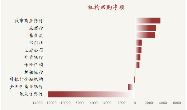 城市商业银行、农商行、券商、基金和保险公司在质押式回购市场主要为资金融入方,其中城市商业银行融入规模最大,其次为农商行,再次为基金、券商和保险。