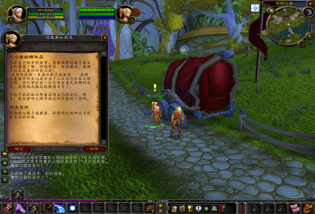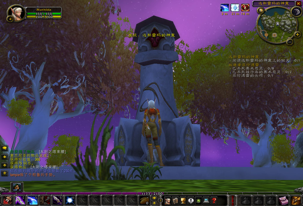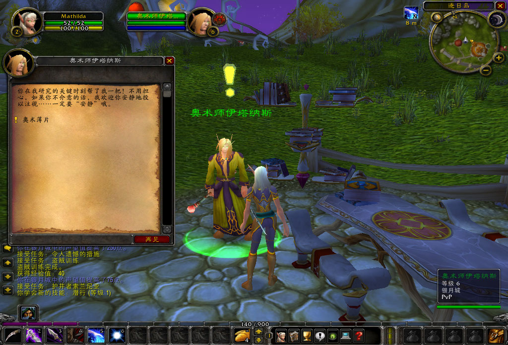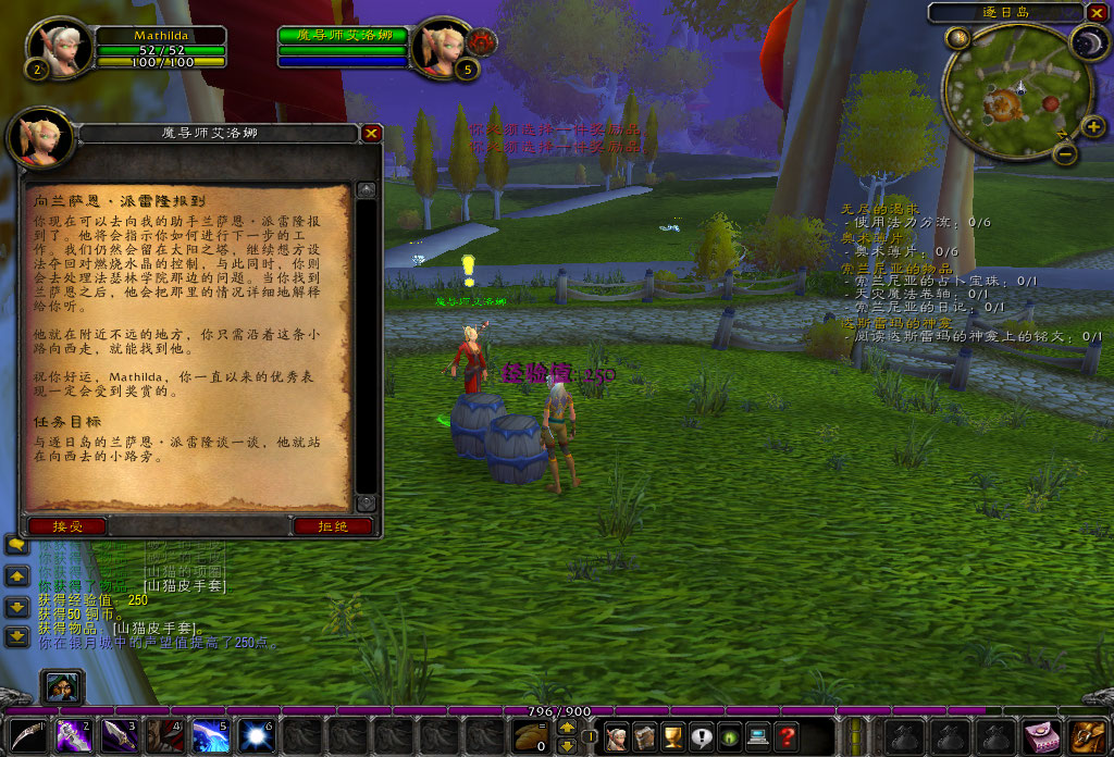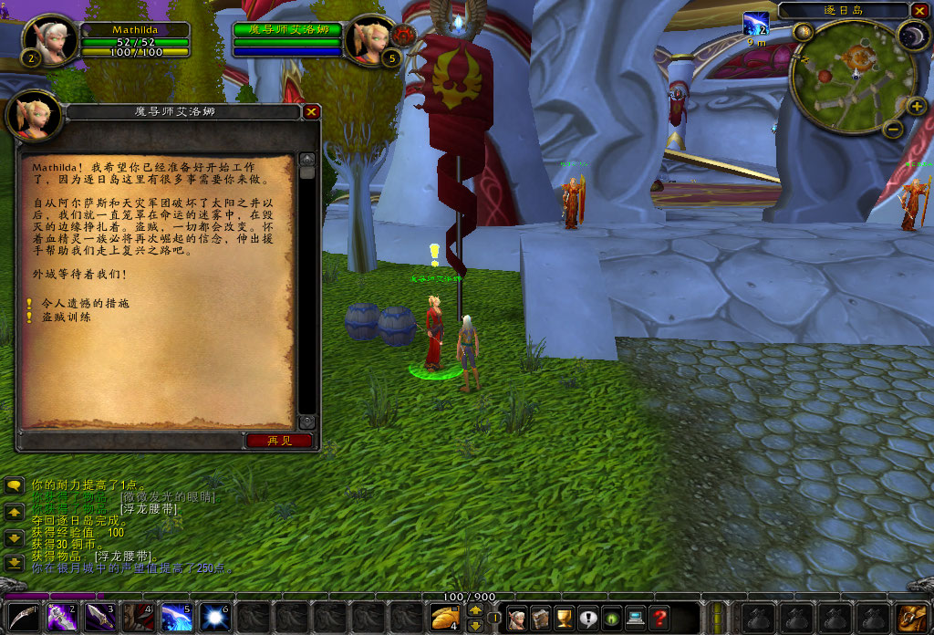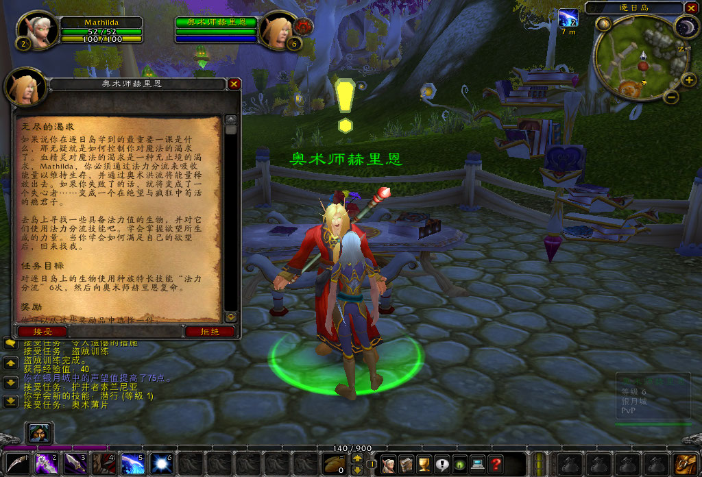 噢,天啊,又是奥术师,不过这个叫赫里恩的红衣男说的话似乎更能让我理解。他说血精灵是对魔法能量无限渴求的种族,我们都必须要使用种族技能:“法力分流”来吸取能量。这是血精灵必修的一课,就好像幼虎必须学会自己捕食一样。试炼并不难,只要对岛上的生物使用六次“法力分流”就可以。“不过那些山猫可是没有法力的”。唉,新手又不是白痴,这样的叮嘱大可不必。
