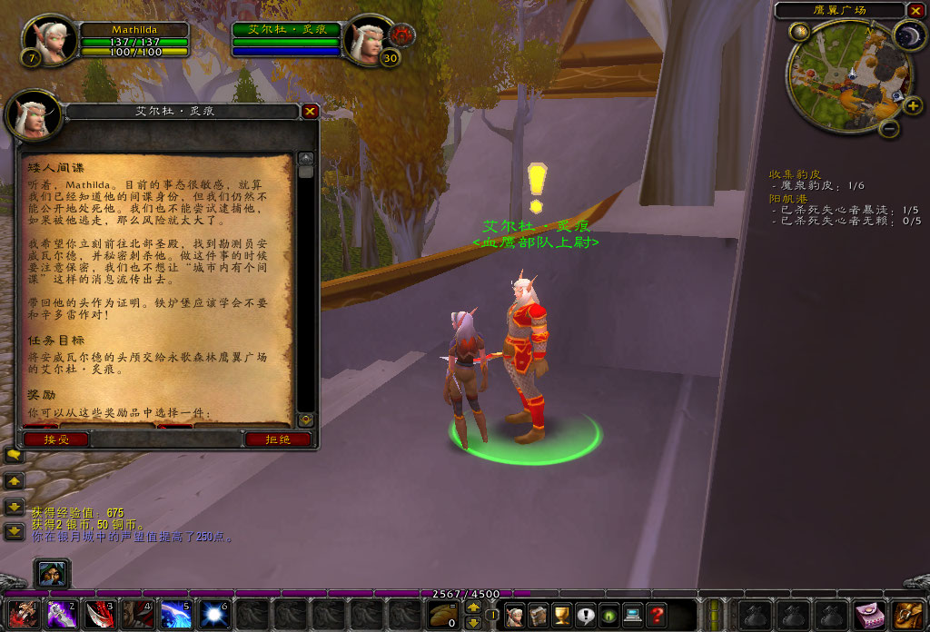 带着一身的奥术残渣,我回到了薇兰妮亚身边。交待完任务之后,我迫不及待地打开了一封秘密文件,这是我从一只法力怨灵身上打到的,信中满是不认识的文字,看得我头晕脑胀,不过最后的精灵文我倒是读懂了,艾尔杜·炙痕,这不是鹰翼广场的上尉吗?赶紧去找他。