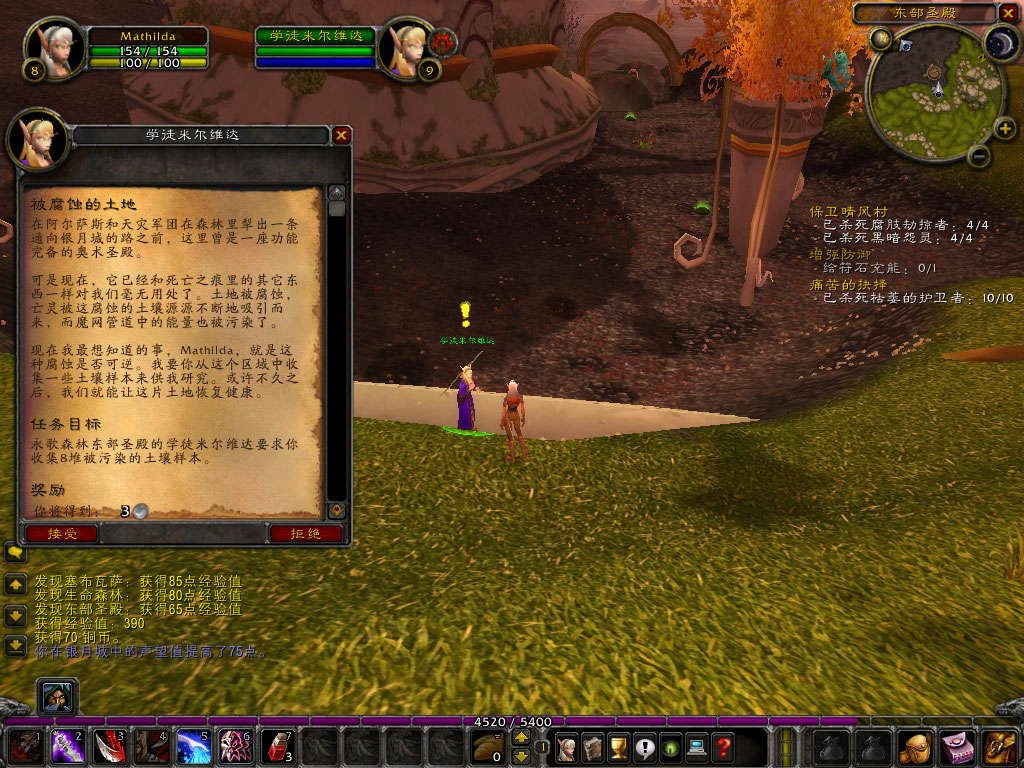 死亡之痕的另一边,是废弃已久的东部圣殿。“这是一块被腐蚀的土地,这里曾是一座功能完备的奥术圣殿,如今我需要一些土壤样本来研究,希望能让这块土地重获生机”。学徒米尔维达恳求我帮帮她完成[被腐蚀的土地]。