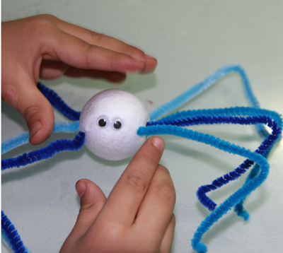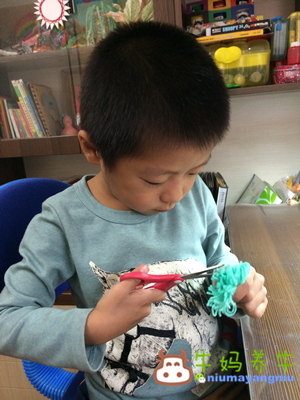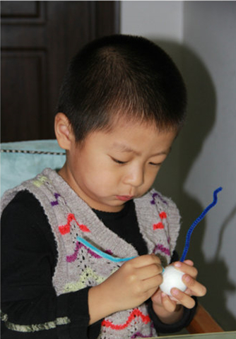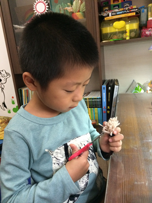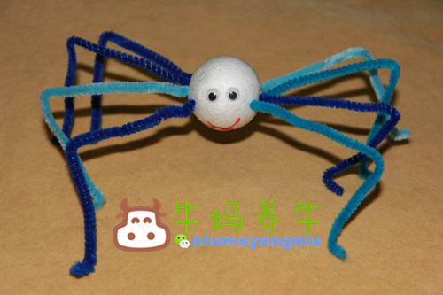 这是牛牛三岁半时制作的,很简单,低龄小朋友可以尝试哦。毛根插在保丽龙球上,贴上活动眼睛即可。