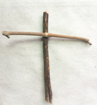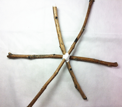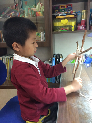 两根树枝交叉,用线固定。(家长完成)