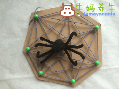 有了蜘蛛,再给它安个家吧,用纸板、蘑菇钉(或大头针,注意安全)、毛线制作。