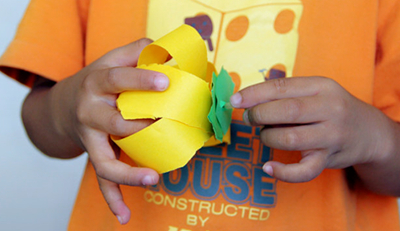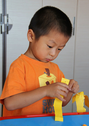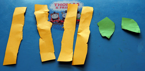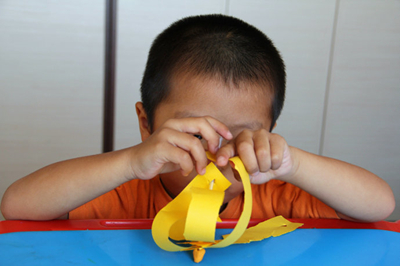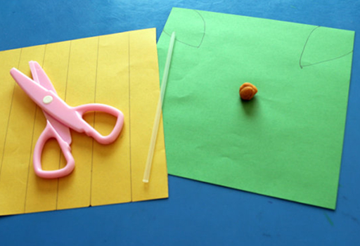 剪成宽纸条后,两端打孔,用吸管穿过,彩泥封堵。